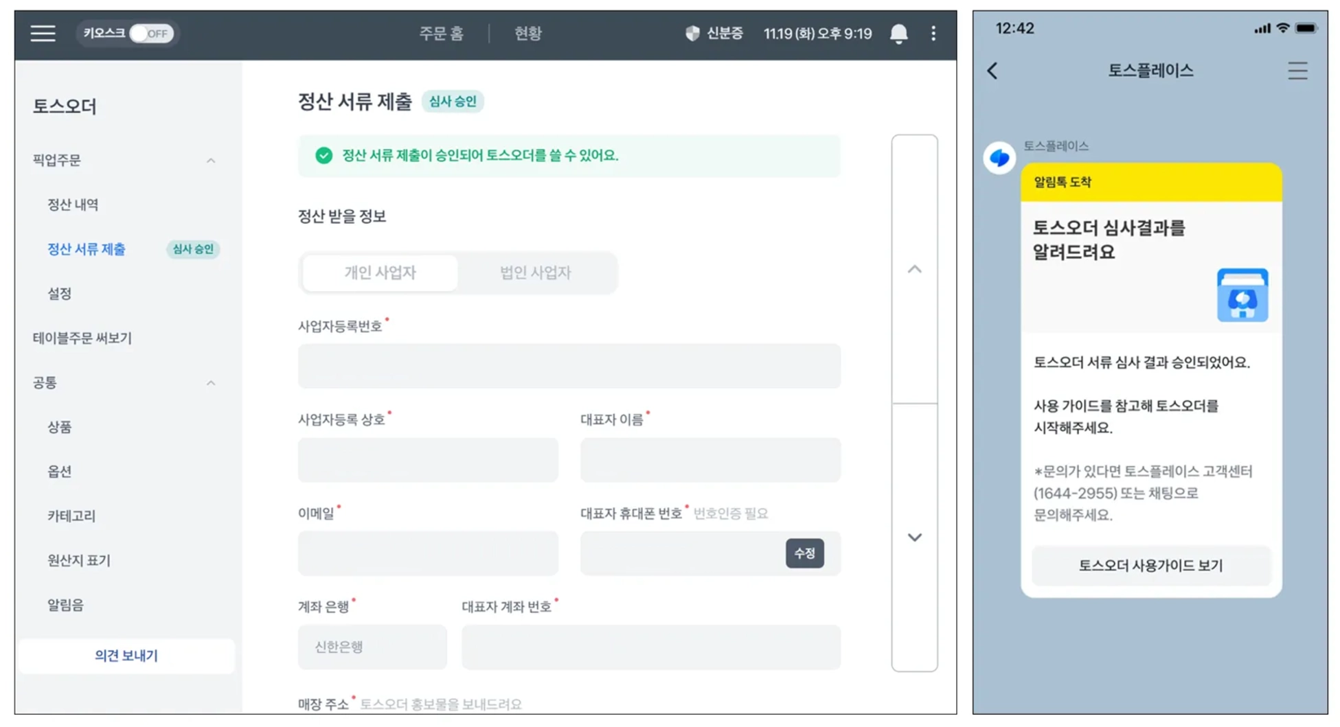 토스오더는 정산 서류 제출 후 승인이 완료되어야 사용 가능해요.