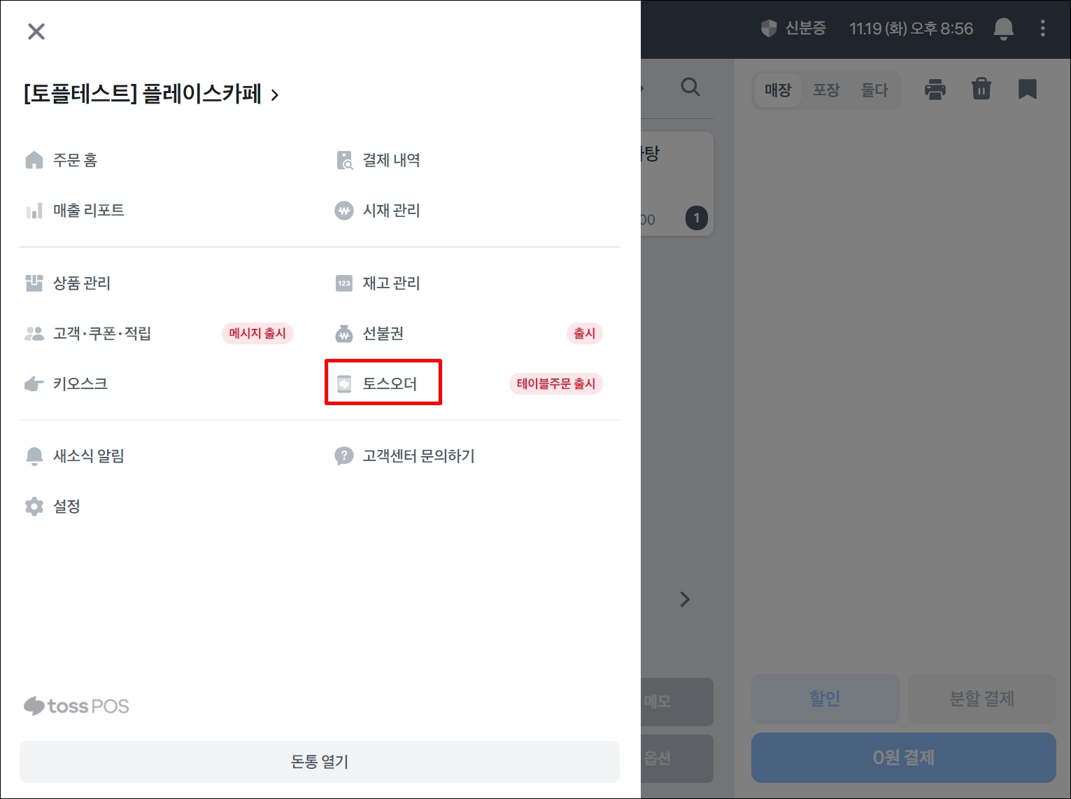 포스 왼쪽 상단 ≡ 버튼 > 토스오더 를 클릭해주세요.