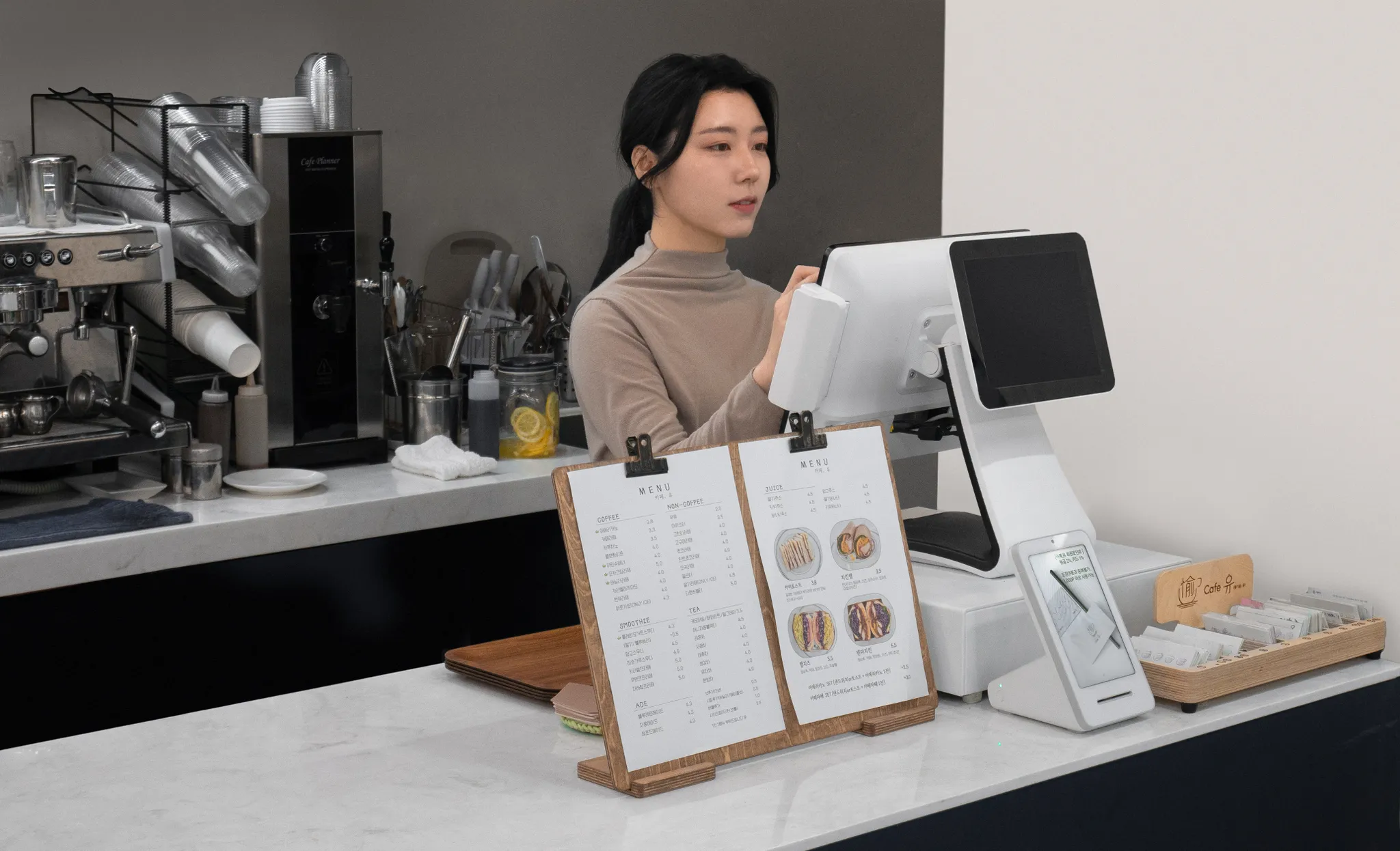 또 주문/계산대는 손님을 가장 먼저 응대하는 공간이잖아요. 깔끔하고, 시인성이 좋아야 고객도 공간을 편하게 느끼시는 것 같아요. 토스 프론트의 디자인이 깔끔하고 밝은 매장 분위기와 잘 어울려서 좋은 것 같아요. 요즘은 업종에 관계 없이 매장 인테리어를 깔끔하고 밝게 많이들 하니까 거의 모든 공간에 잘 어울릴 것 같아요.