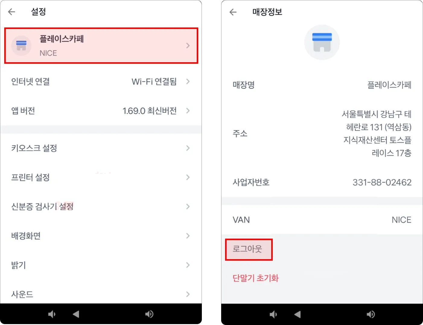 단말기 셋팅을 다시 해야하거나, 가맹점 정보 변경 후 재연동이 필요할 경우 사용하는 로그아웃 방법이에요.