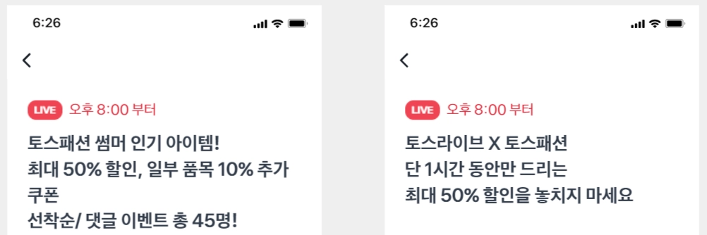 라이브 시간, 메인 타이틀, 라이브 혜택을 확인할 수 있습니다.