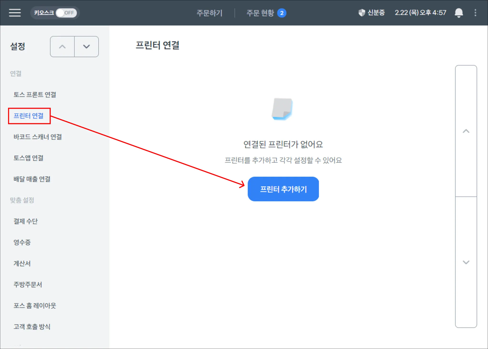 포스 좌측 상단 ≡ → 설정 → 프린터 연결 → 프린터 추가하기 → 연결유형 토스 터미널(무선연결) 선택해주세요.