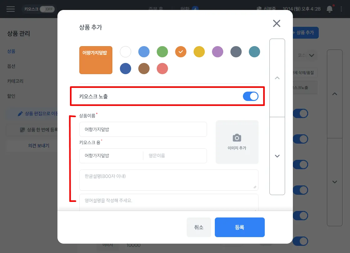 키오스크 노출을 켜면, 아래 상품 설명을 적을 수 있도록 펼쳐져요.