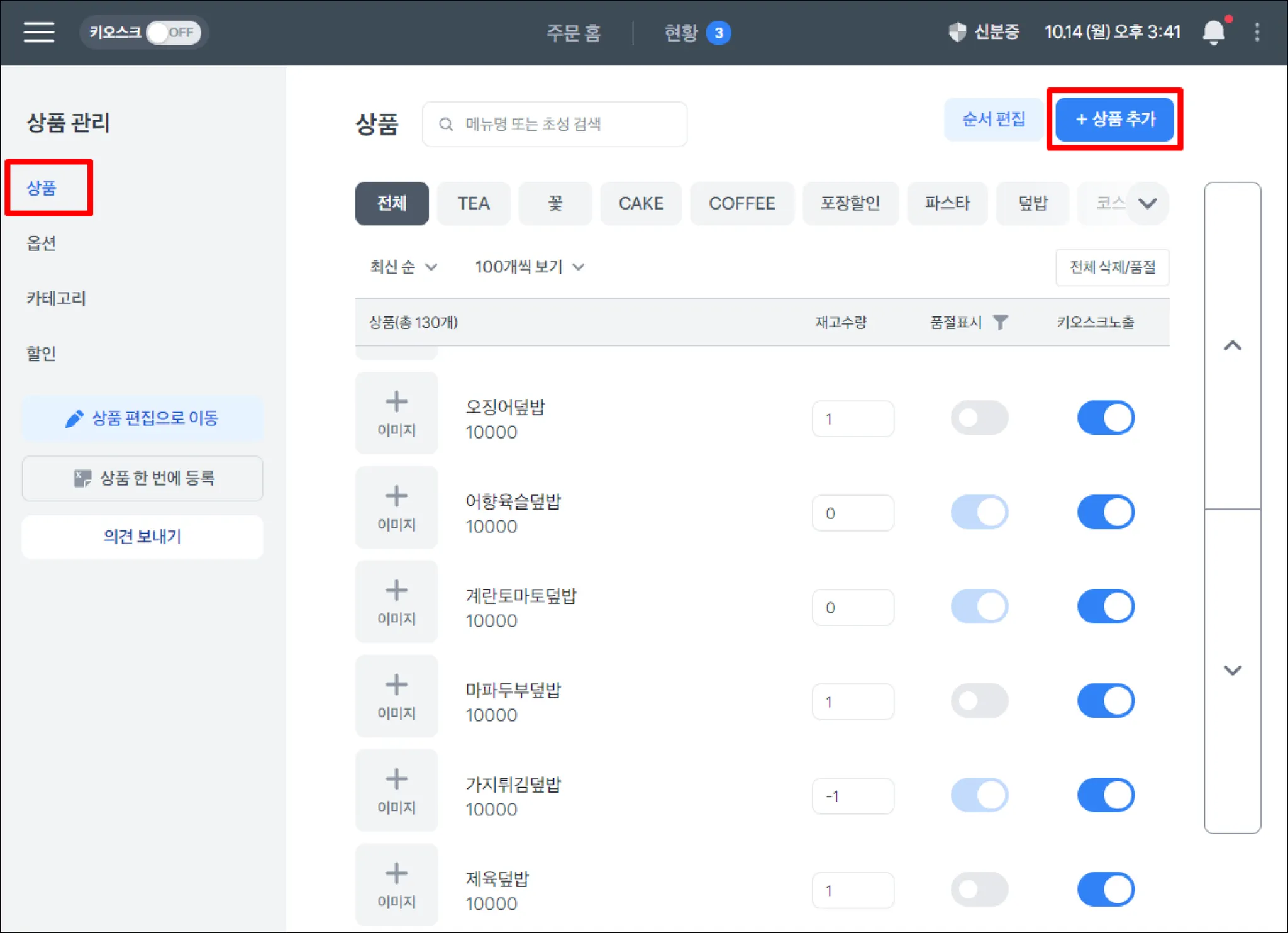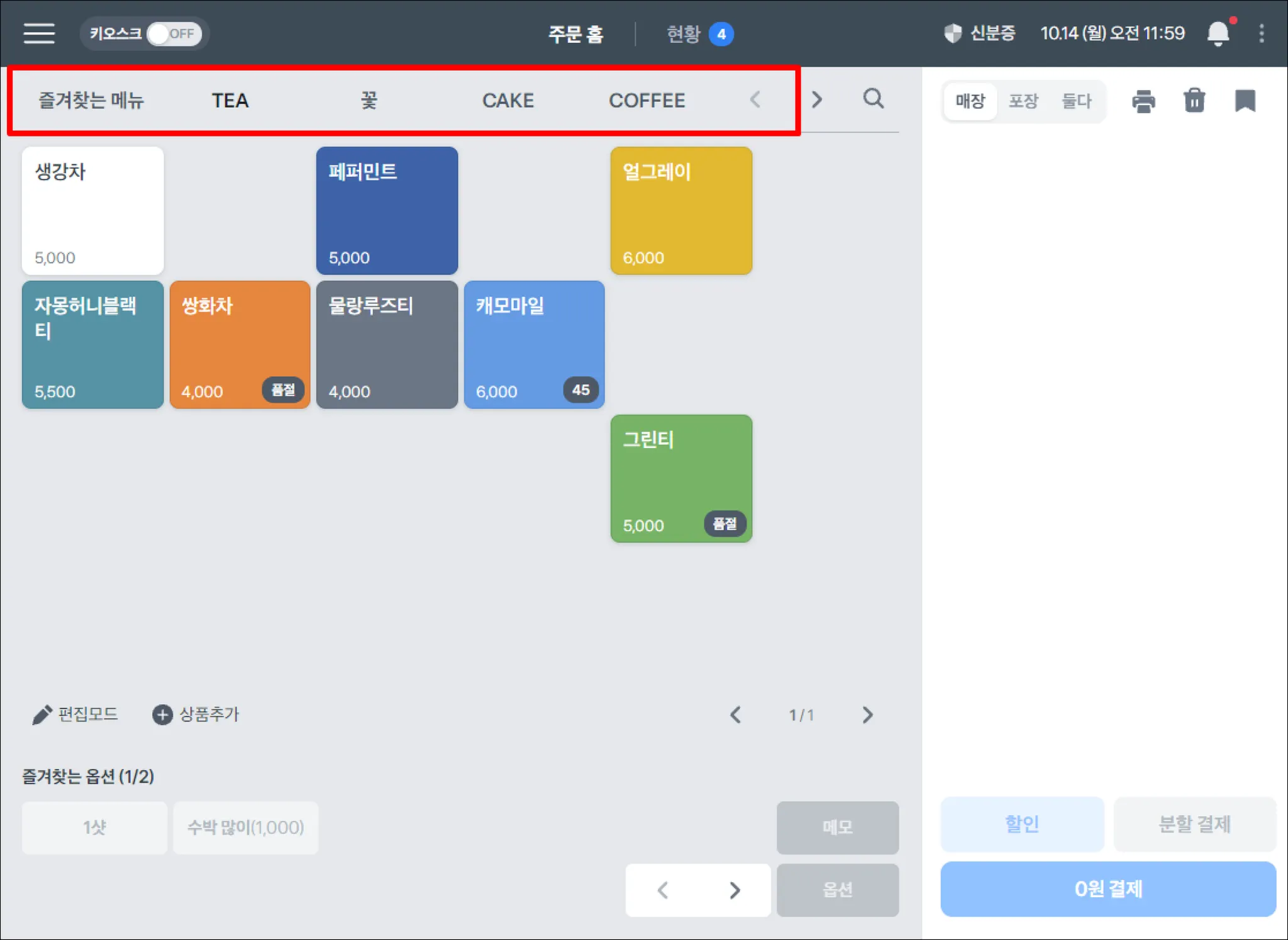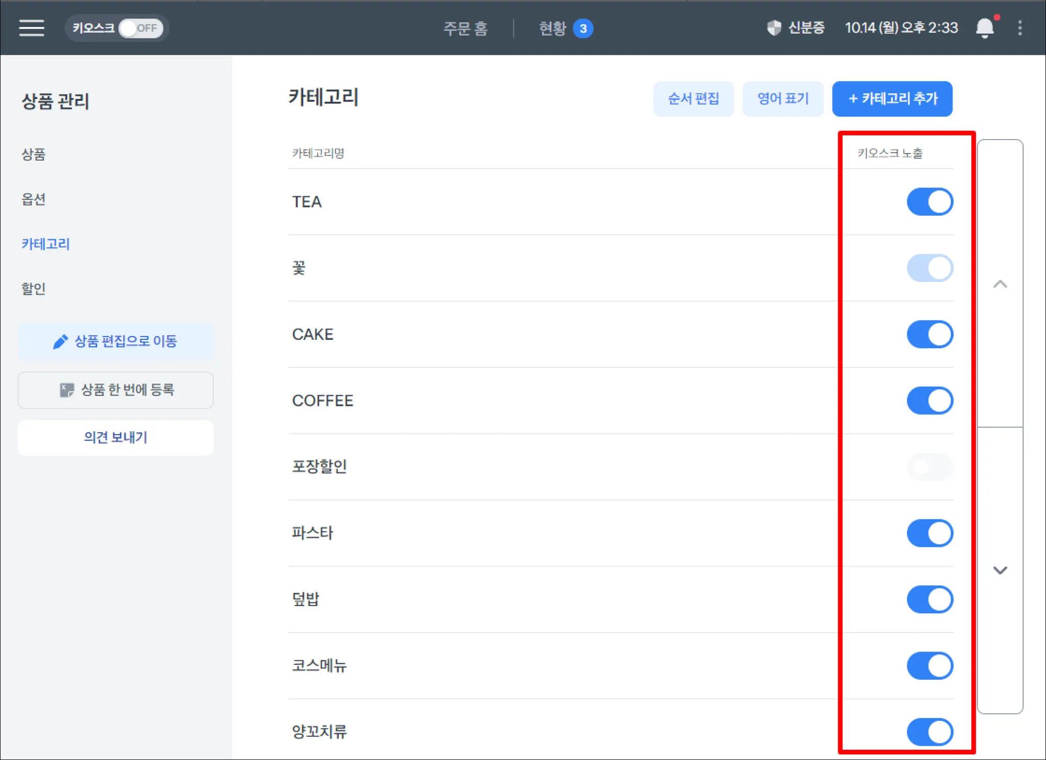 포장할인과 시가 상품이 있는 카테고리는 키오스크 노출이 안되도록 비활성화 되어 있어요.