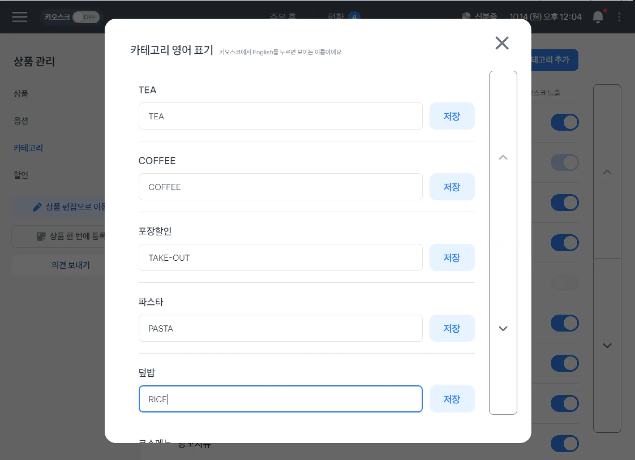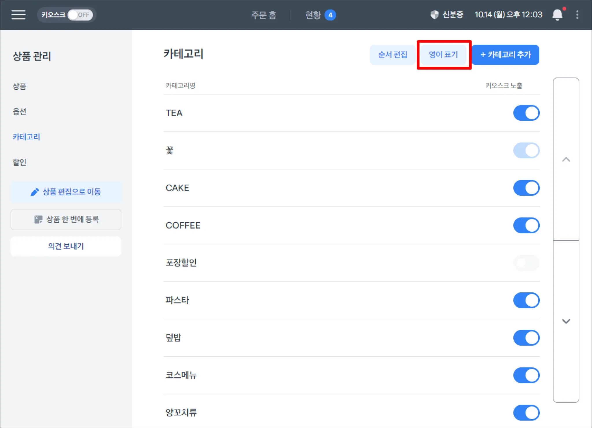 카테고리의 영어 표기는 키오스크 모드로 사용 할 때 영어모드에서 지원돼요.
