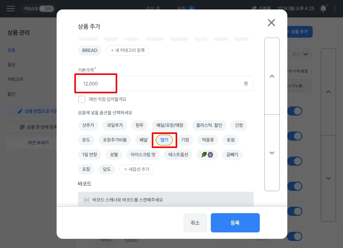 옵션을 설정하면, 기본 판매 메뉴에 추가 옵션을 적용할 수 있어요.