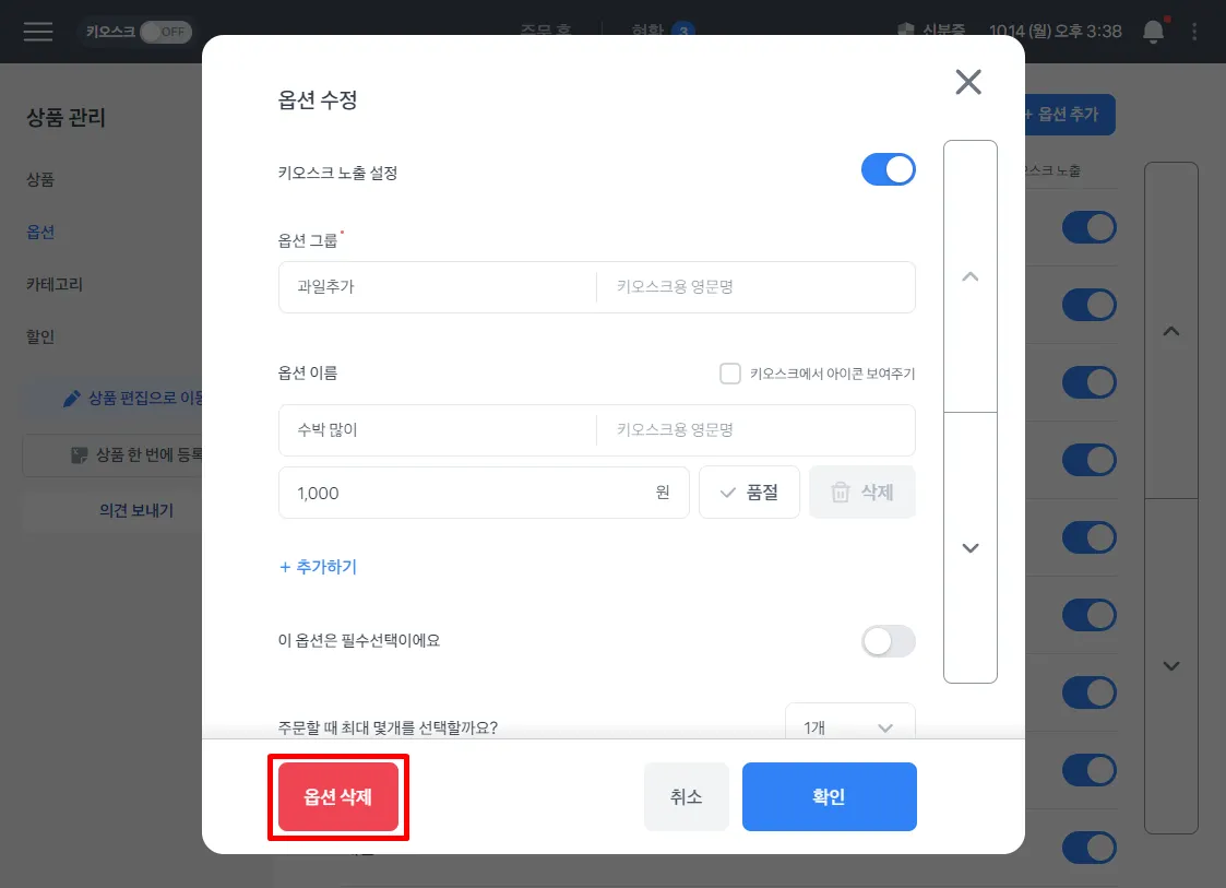 ① 키오스크에 옵션을 노출 할 것인지 ON/OFF 할 수 있어요.