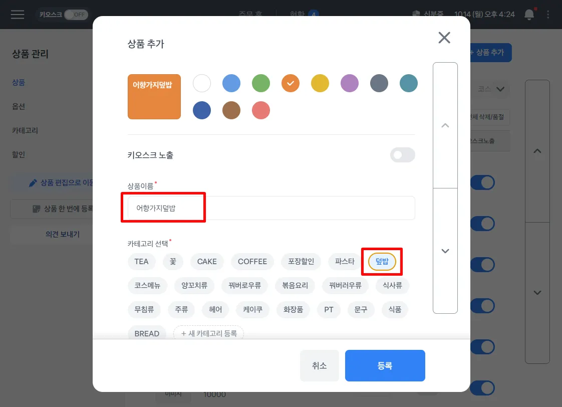 포스에 등록해서 판매할 우리 가게의 메뉴를 등록해볼게요.