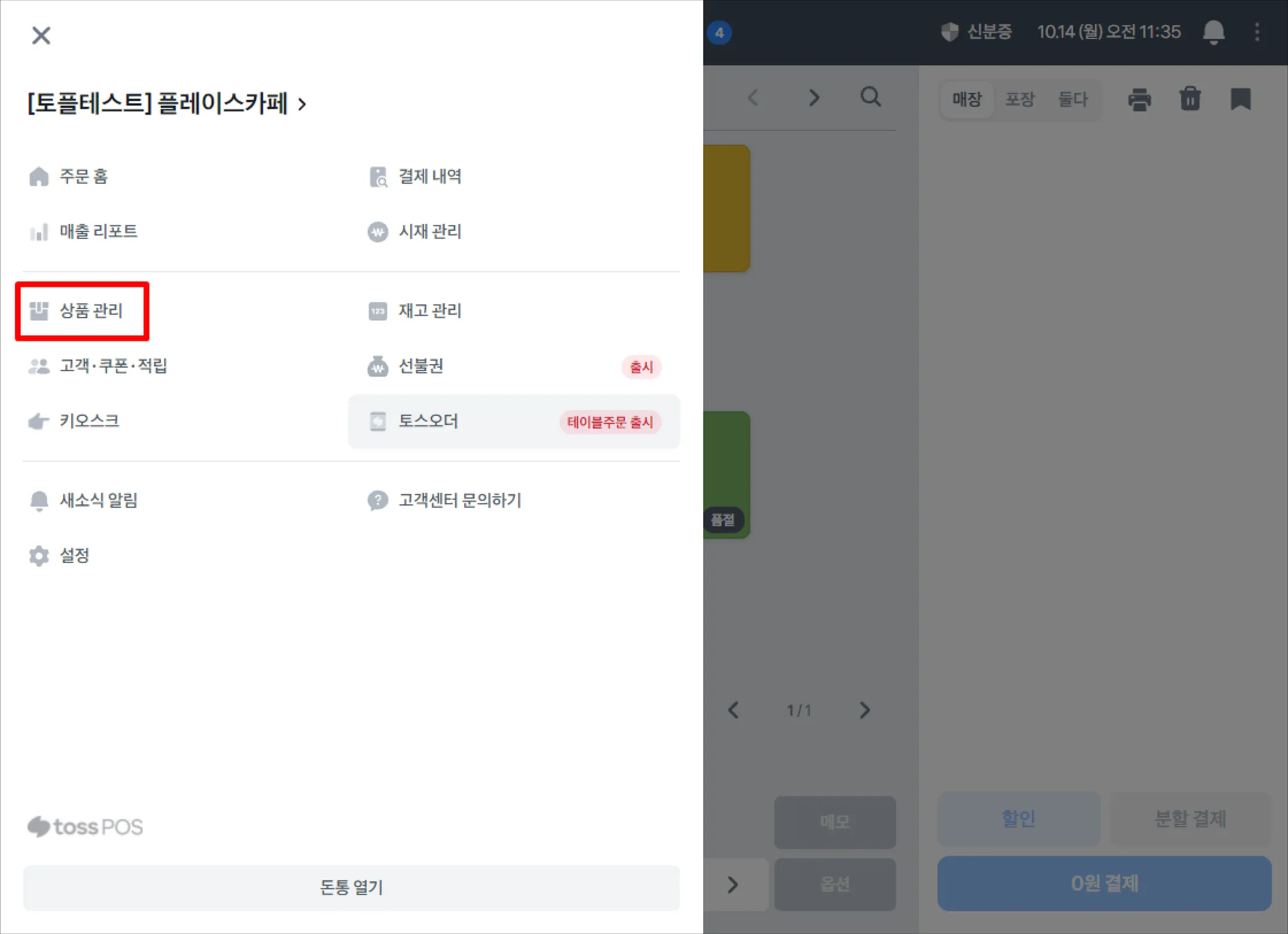 포스 왼쪽 상단의 ≡ 버튼을 클릭하고 상품관리 버튼을 클릭해주세요.