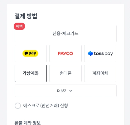 가상계좌 결제수단을 이용하는 경우 구매자가 환불 받을 계좌 정보를 결제창에서 입력 받을 수 있는 기능이 추가됐어요. 입력된 환불계좌 정보는 결제 승인 API 응답으로 확인할 수 있어요. 자세한 내용은 개발 문서를 참고해주세요.