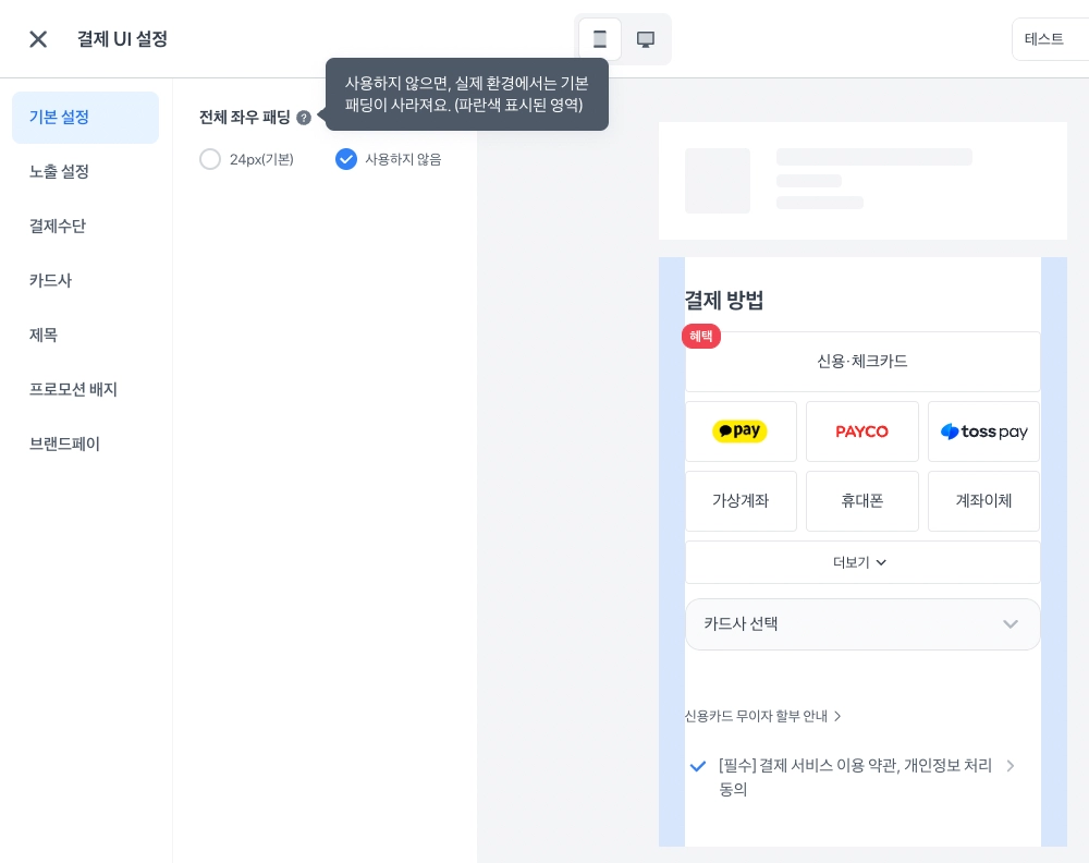 운영하고 있는 사이트의 주문서 페이지에 기본으로 좌우 패딩이 들어가 있는 경우 결제위젯의 패딩 값을 없앨 수 있는 기능이 추가됐어요.