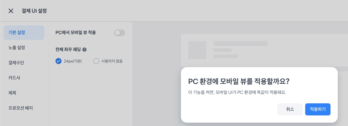 PC를 위한 별도 레이아웃을 지원하지 않고 모바일 뷰만 제공하는 사이트를 위하여 PC에서도 결제위젯의 모바일 뷰를 적용할 수 있는 설정이 추가됐어요.