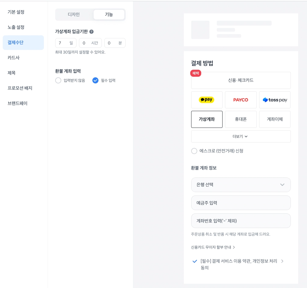 상점관리자 → 결제 UI 설정 → 결제수단 → 기능 → 환불 계좌 입력 설정을 통해서 사용 여부를 설정하실 수 있어요.
