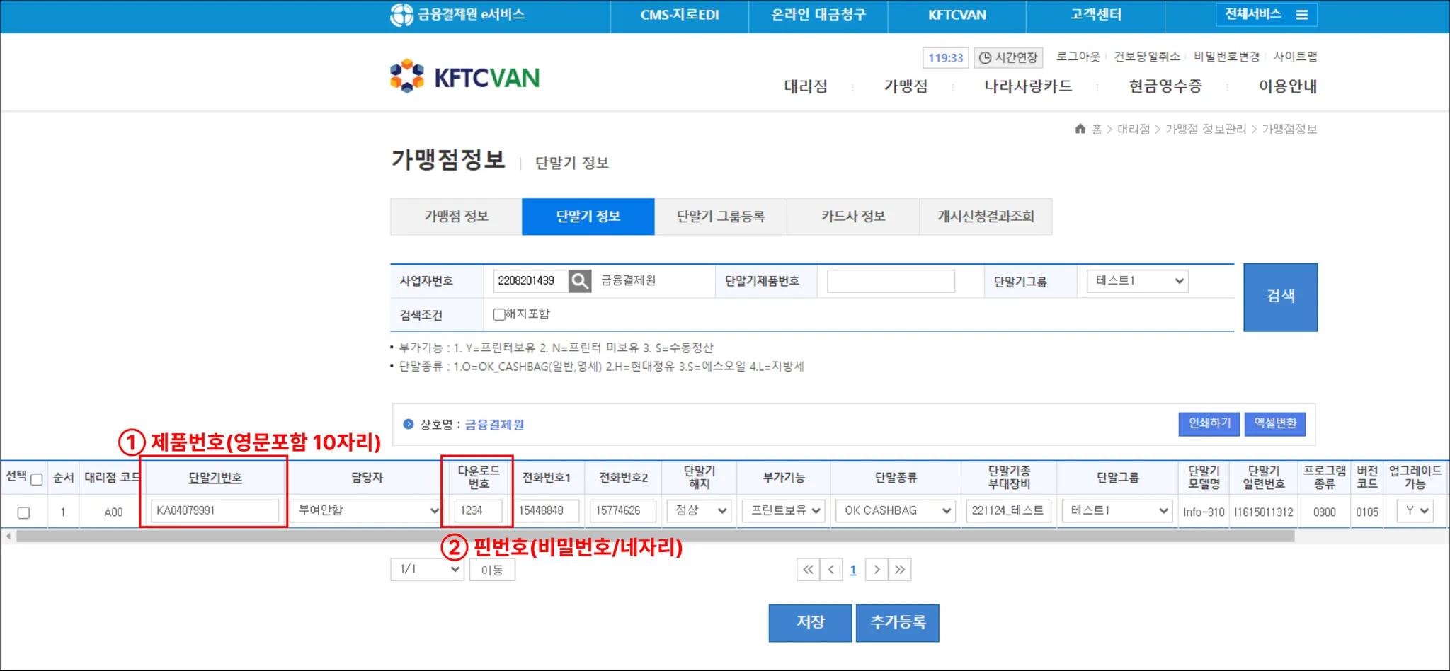 금결원 전산 → 가맹점 정보 관리 → 가맹점 정보 → 단말기 정보