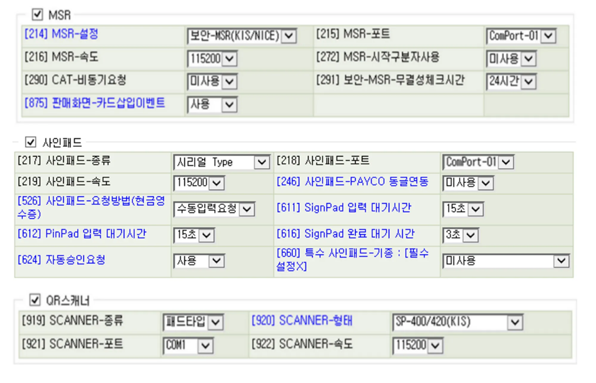 특수 키 → 11.장치 → 멀티패드 사용여부 → 1.예 → 사용포트 선택 - 서명패드 → 연동속도 → 4.115200 선택