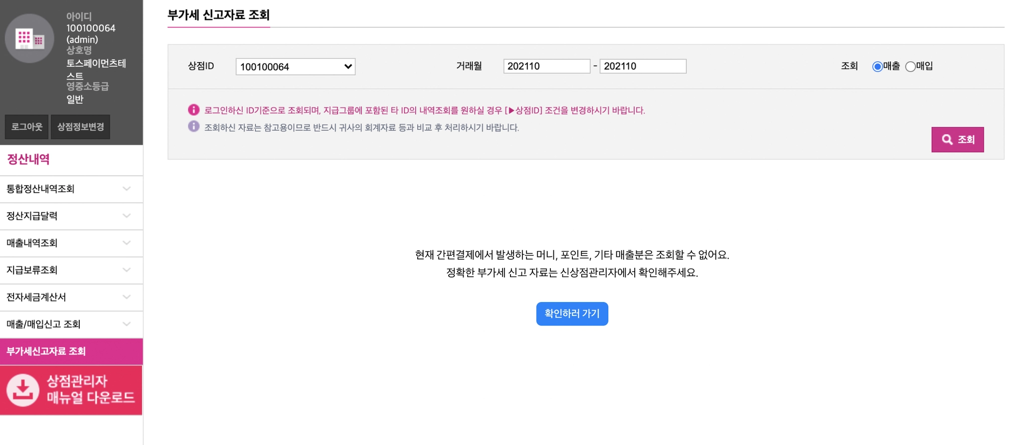 ➀ [관리자] 구 상점의 ‘부가세 신고자료 조회’ 메뉴를 클릭. 중앙의 ‘확인하러 가기’ 버튼을 누르세요.