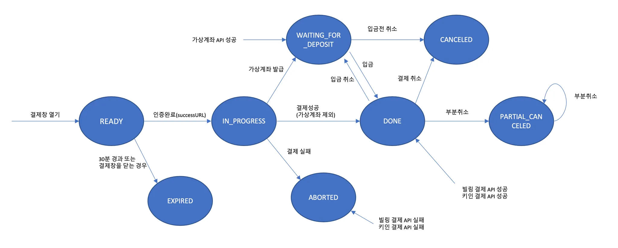https://docs.tosspayments.com/reference#payment-객체 의 status 항목이 설명되어 있고, 각status 별로 이동하는 이벤트는 아래 그림과 같습니다.