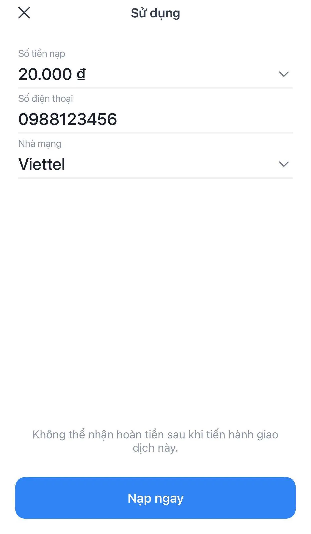 Hiện tại, Toss chỉ hỗ trợ nạp cho số điện thoại bạn đang đăng nhập ở tài khoản Toss.
