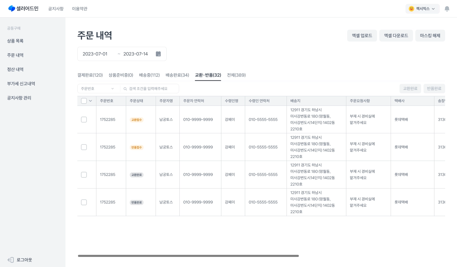 교환/반품 처리가 완료된 주문건은 체크박스 선택 후, 우측의 교환완료/반품완료 버튼을 눌러주세요.