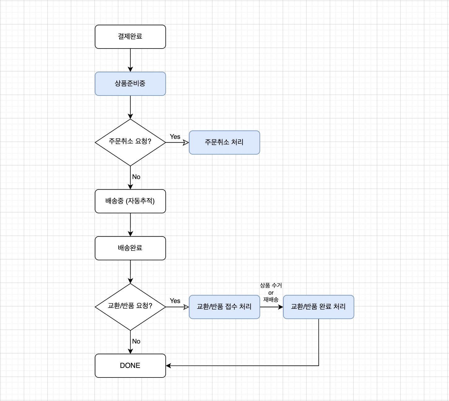 파란색 블록은 셀러 어드민에서 직접 처리해주셔야하는 단계입니다. 누락 건이 발생하지 않도록 특히 유의해주시길 바랍니다.