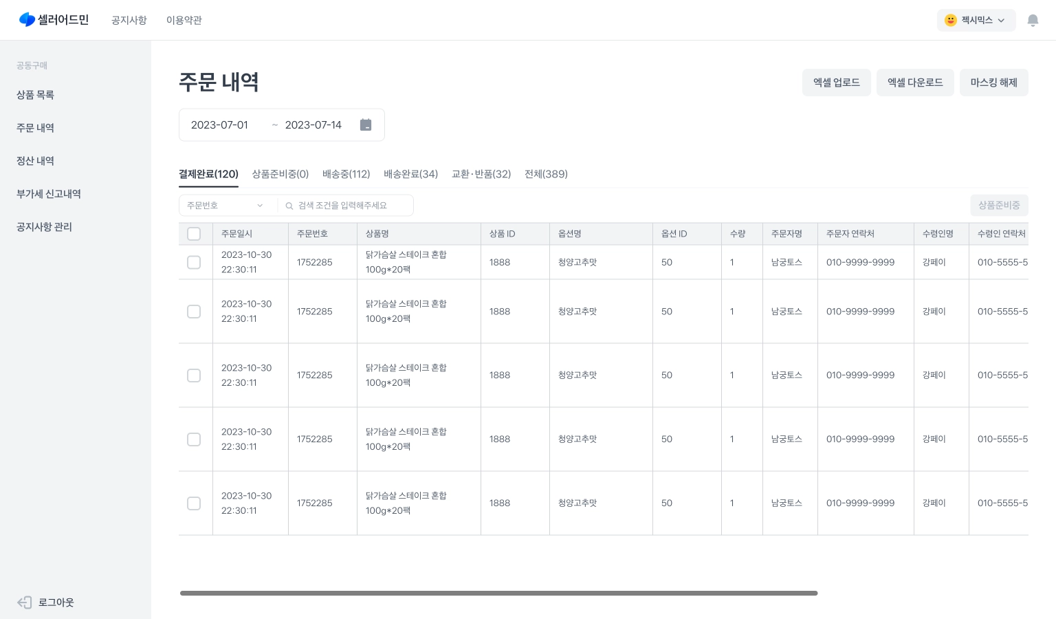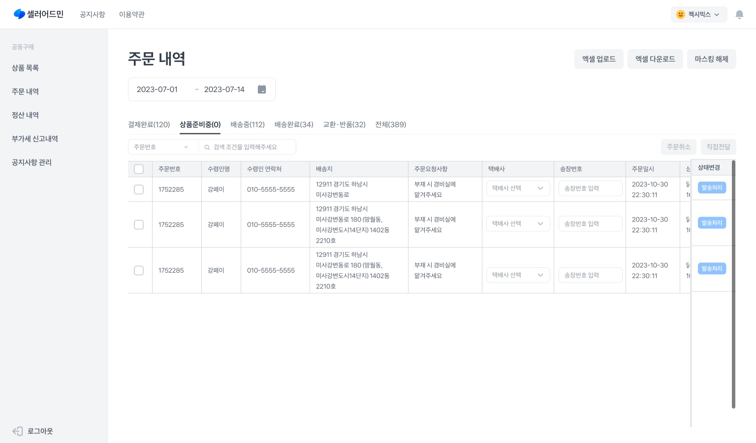 주문자의 이름 일부, 연락처의 가운데, 상세주소는 기본적으로 마스킹 처리가 되어있어요.