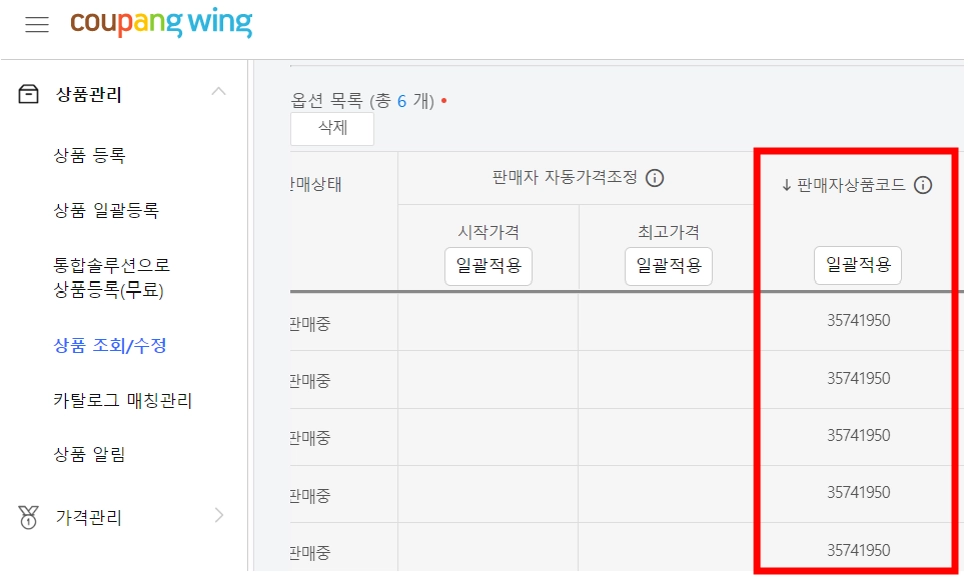 상품관리 > 상품 조회/수정 > 옵션 > 옵션수정 > 옵션별로 모두 동일한 상품코드를 입력해주세요.