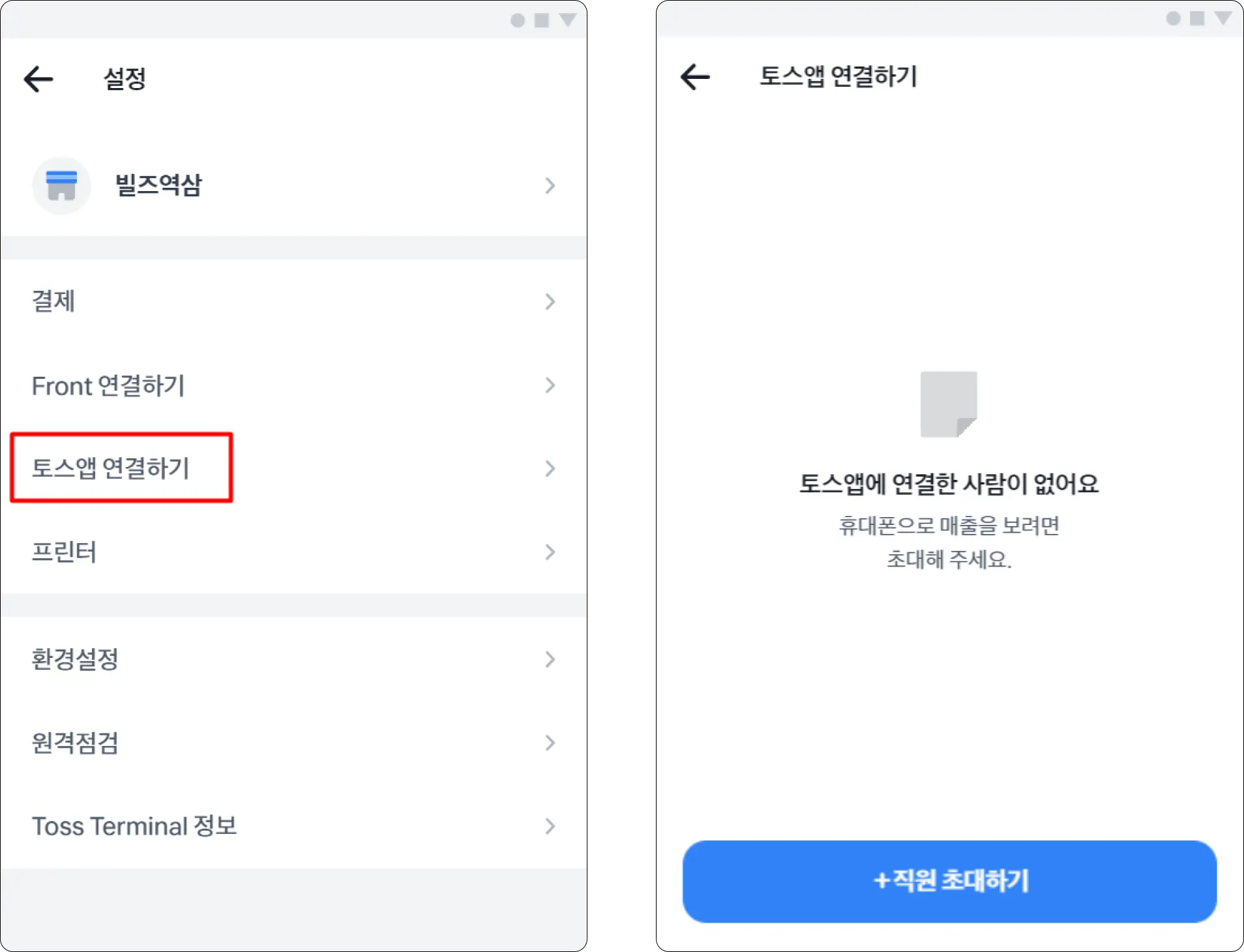 터미널 왼쪽 상단 ≡버튼 > 설정 > 토스앱 연결하기 > 직원 초대하기를 선택해주세요.