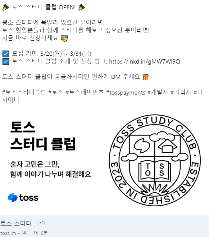 토스 공식 링크드인, PAP 커뮤니티 홍보