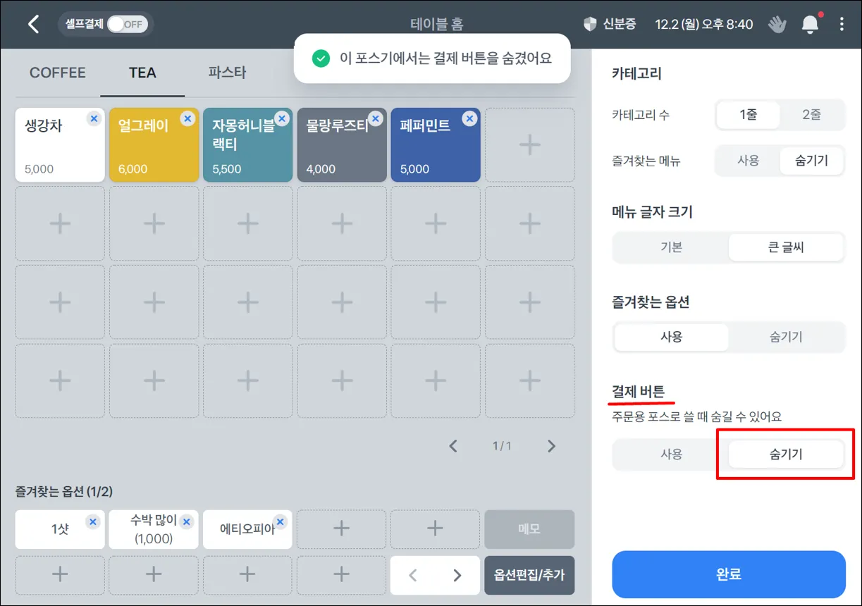 주문 전용 포스기(=오더포스 전용) 를 쓸 때 결제 버튼을 숨길 수 있도록 도와드리는 기능이에요.