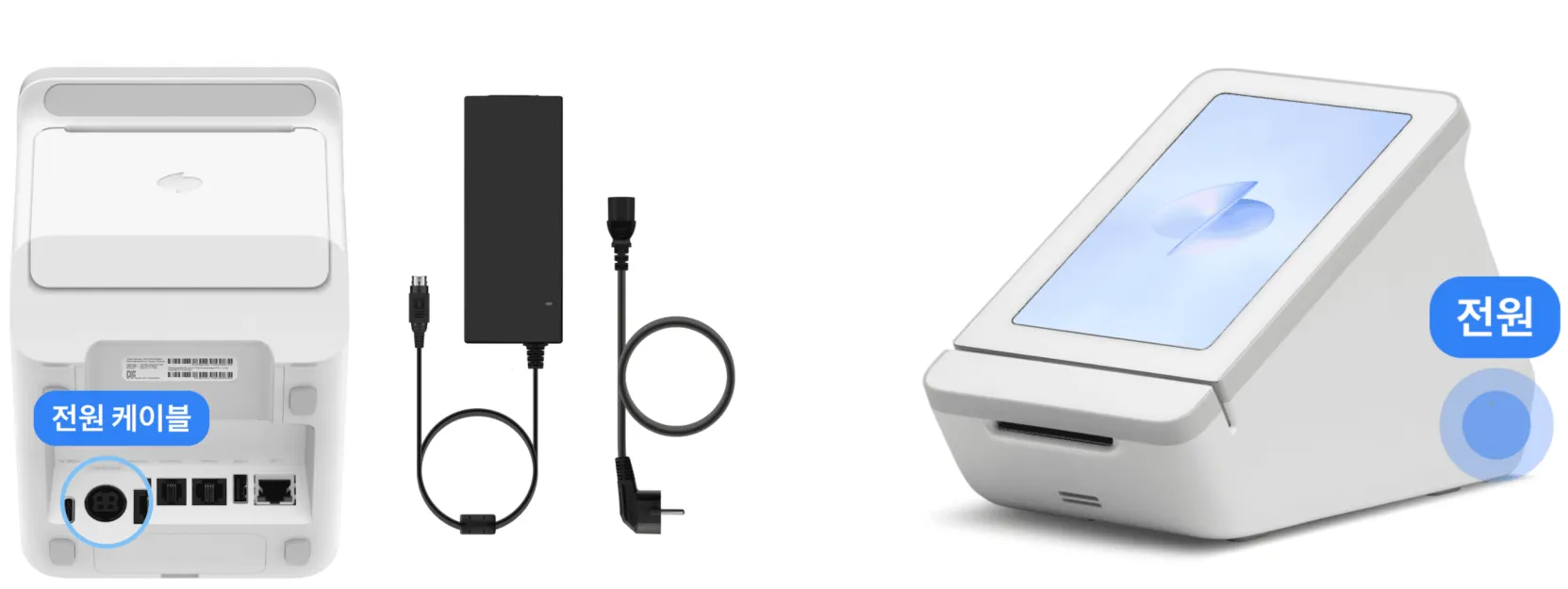 검은색 전원케이블과 어댑터를 이용해 터미널 뒷면 두번째에 꽂고 콘센트를 연결하세요. 오른쪽 측면 버튼을 꾹 눌러서 전원을 켜주세요