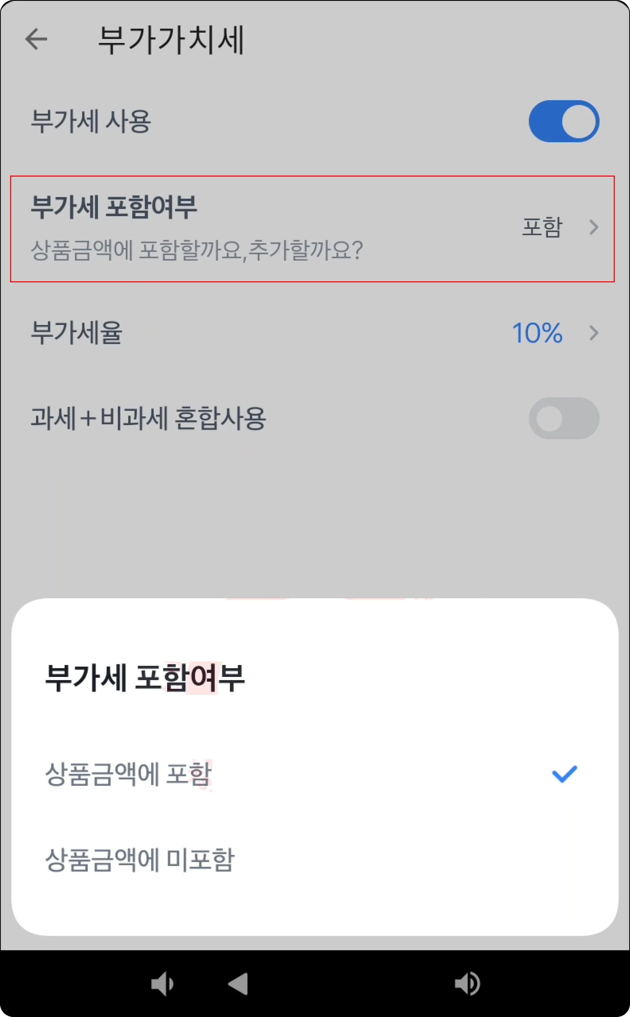 부가세 포함여부는 상품금액에 포함할 지 여부를 선택하는 화면이에요.
