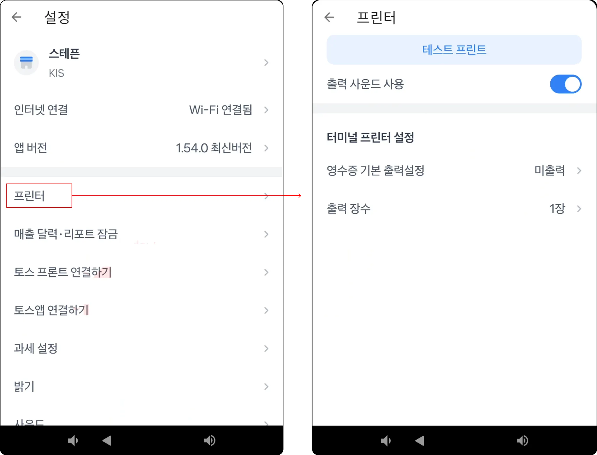 프린터 (사운드 ON, 영수증 출력 여부 설정, 출력 장수 설정)