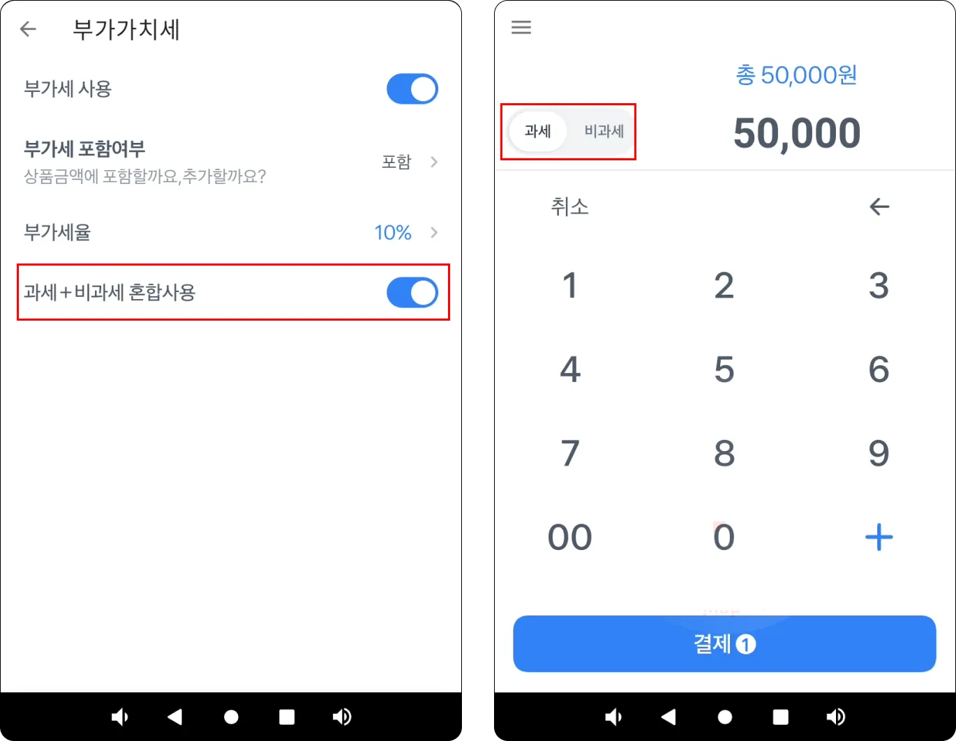 혼합 사용 활성화 시, 결제 금액 입력 화면에서 과세/비과세를 선택할 수 있어요.