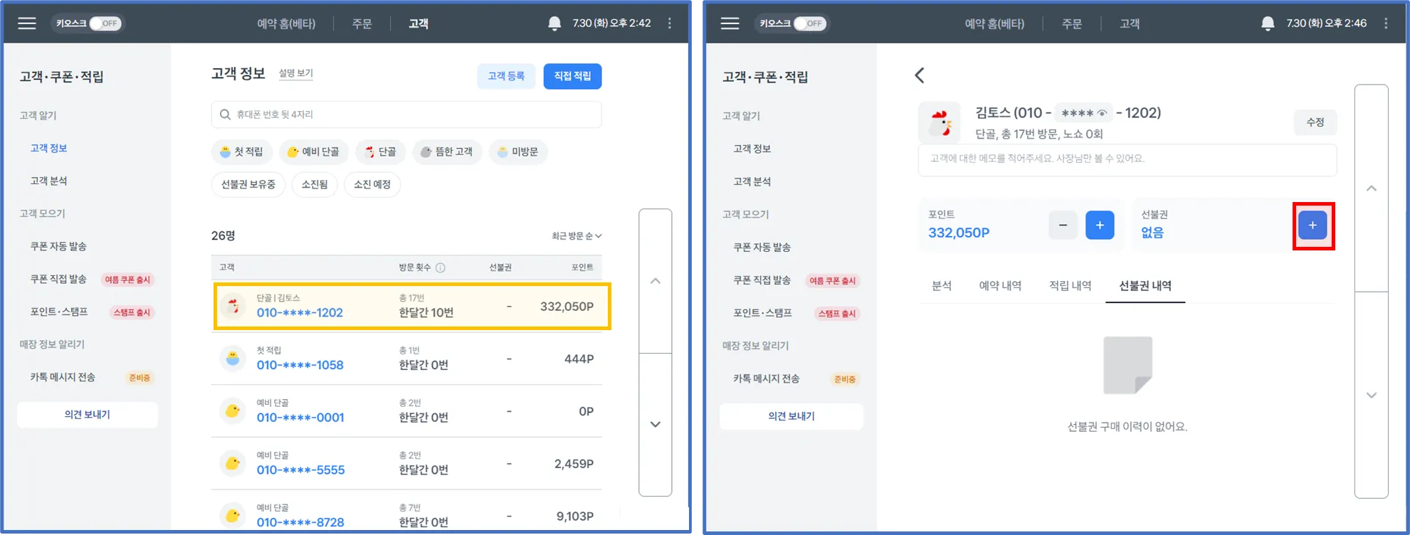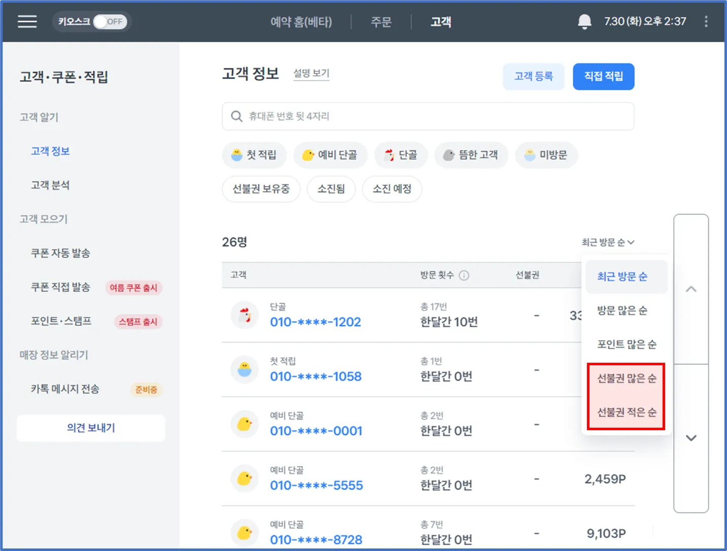 고객 · 쿠폰 · 적립 → 고객 정보에서 선불권 정렬 기준으로 볼 수 있어요.