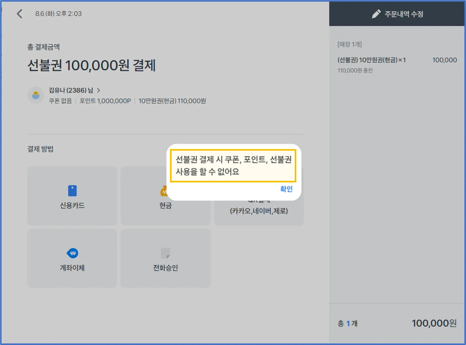 선불권 결제 창에는 고객 정보가 함께 표시되고, 선불권 충전 시 알림톡이 발송돼요.
