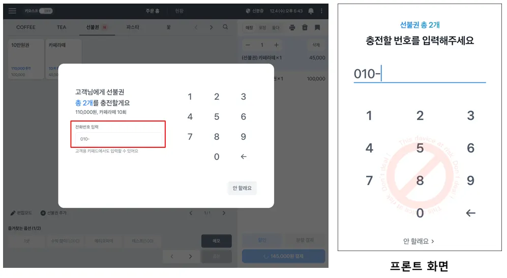 선불권 충전 시, 고객 전화번호로 맵핑이 필요하기 때문에 포인트 적립과 동일하게 전화번호를 수기 입력해야 돼요.