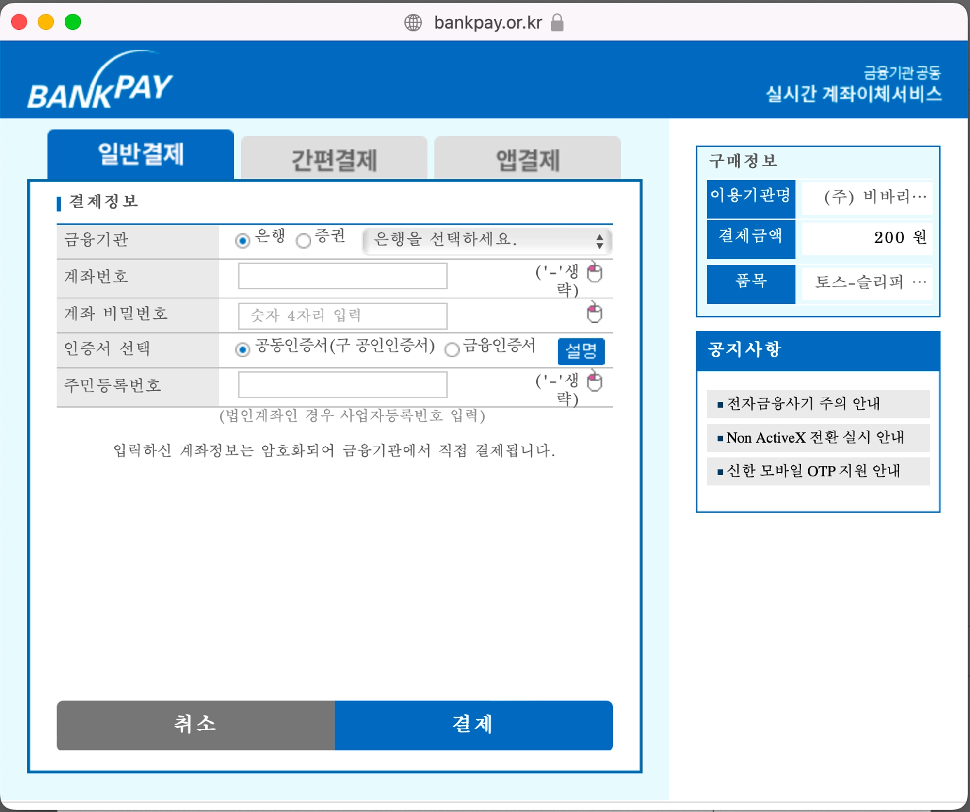결제창에서 주민등록번호 입력하고, 계좌번호 입력하고 공인인증서 등으로 인증을 완료해서 결제했던 방식.