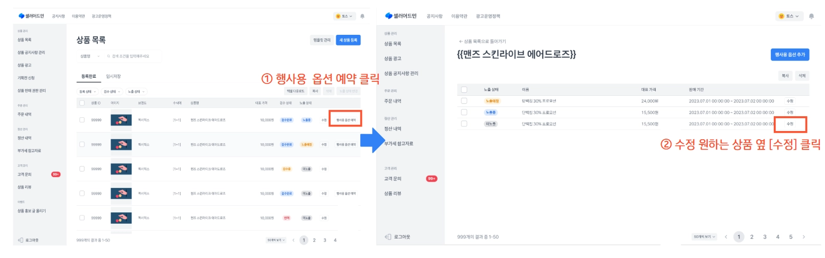 경로 : 토스쇼핑 파트너스 → 상품 목록 → 수정 원하는 상품 옆 [행사용 옵션 예약] → [수정]