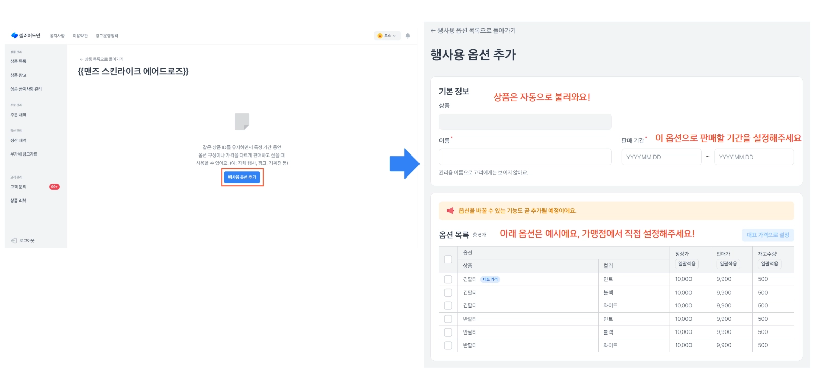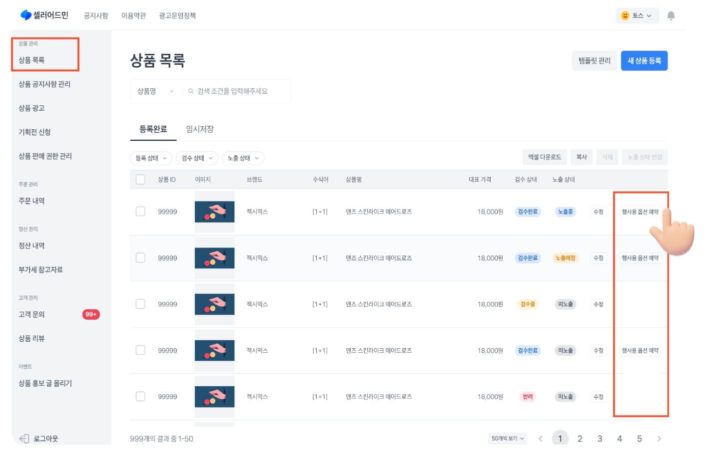 경로 : 토스쇼핑 파트너스 → 상품 목록 → 행사용 옵션 예약
