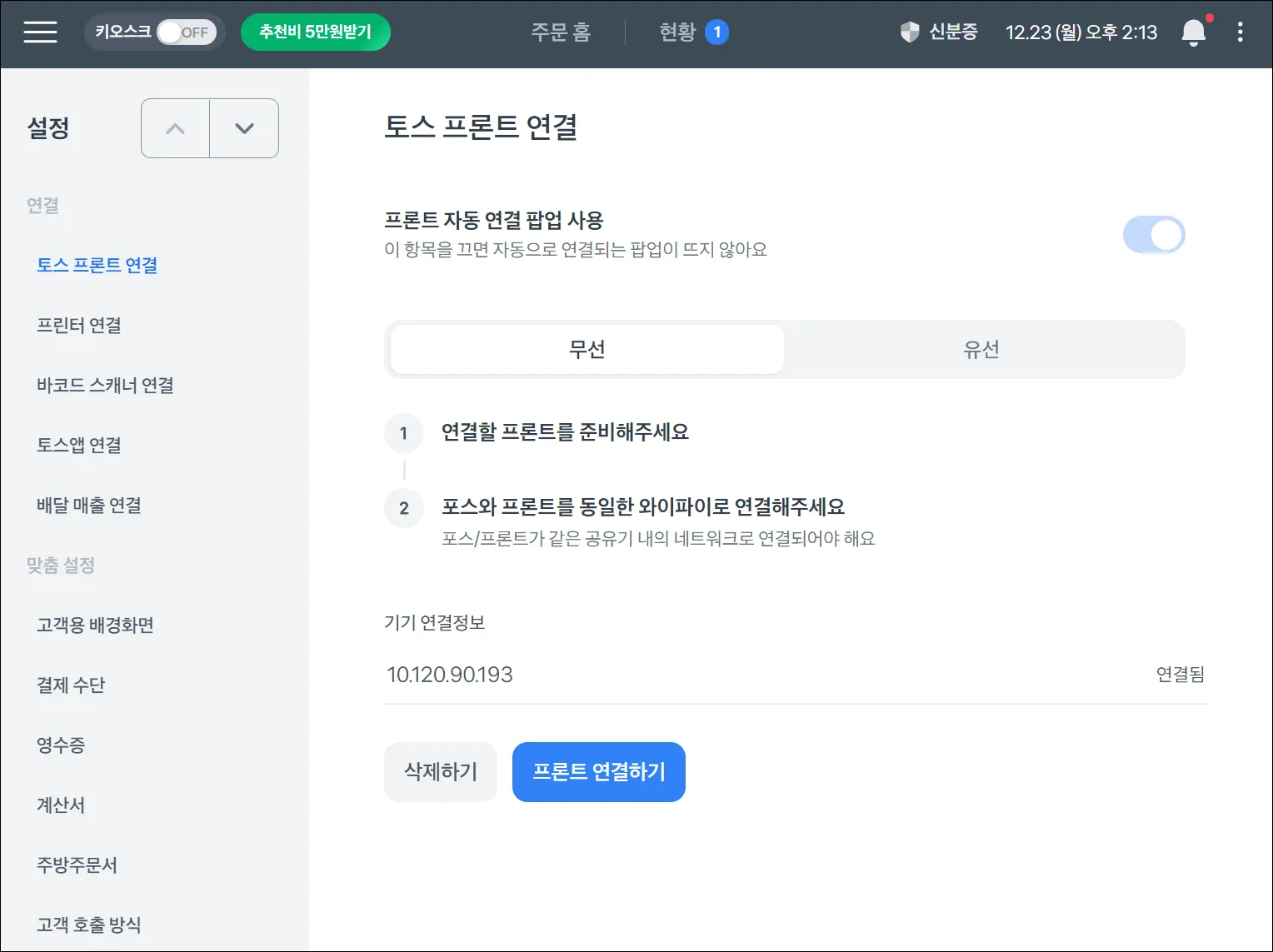 토스포스와 프론트 단말기가 같은 wifi에 연결되어 있다면, 바로 연결돼요.