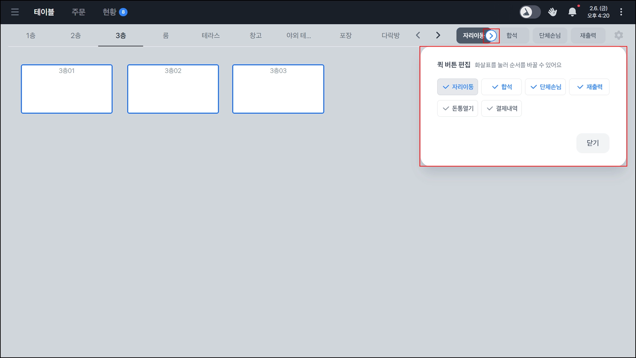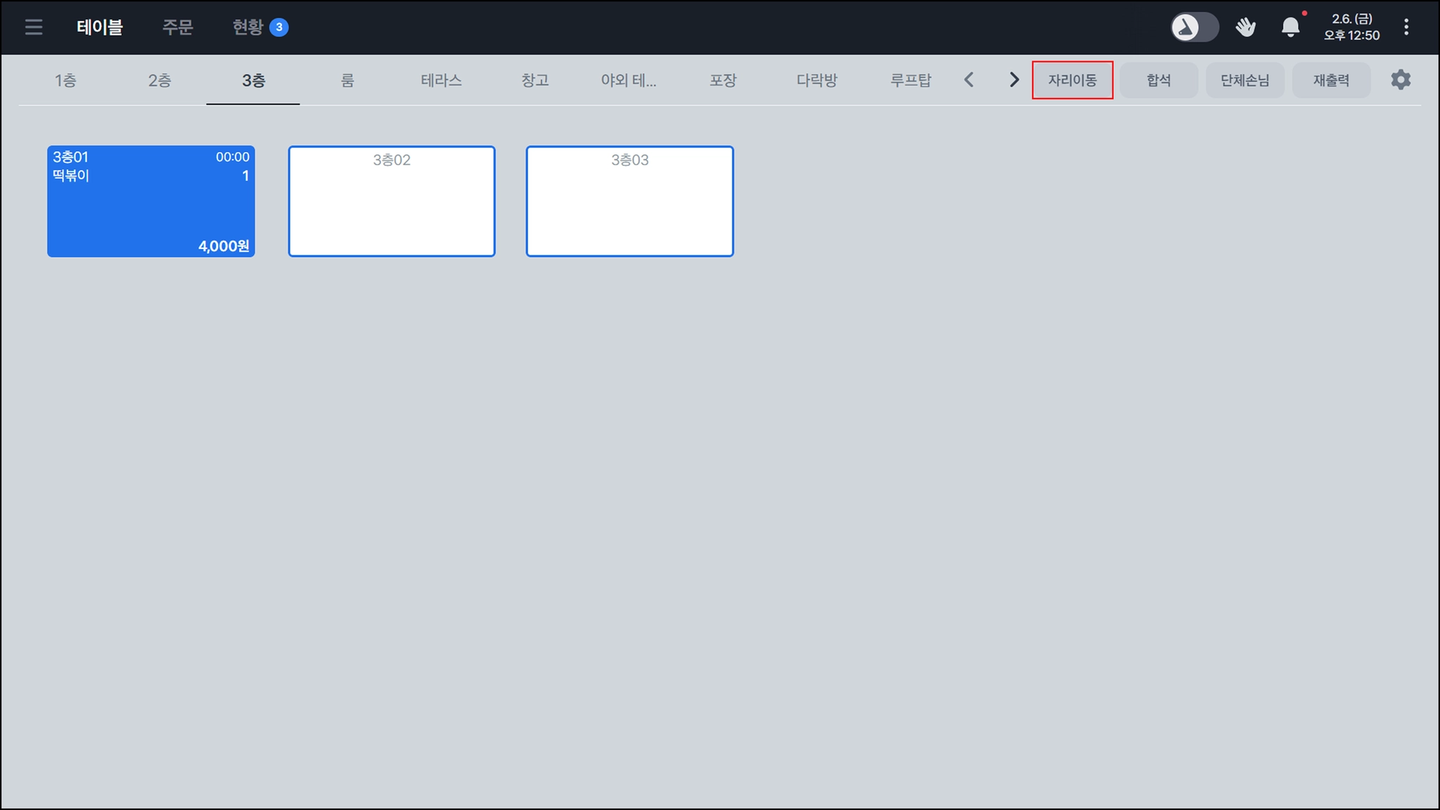 우측 상단의 자리이동을 눌러, 주문내역을 기존 테이블 → 다른 테이블로 옮길 수 있어요.
