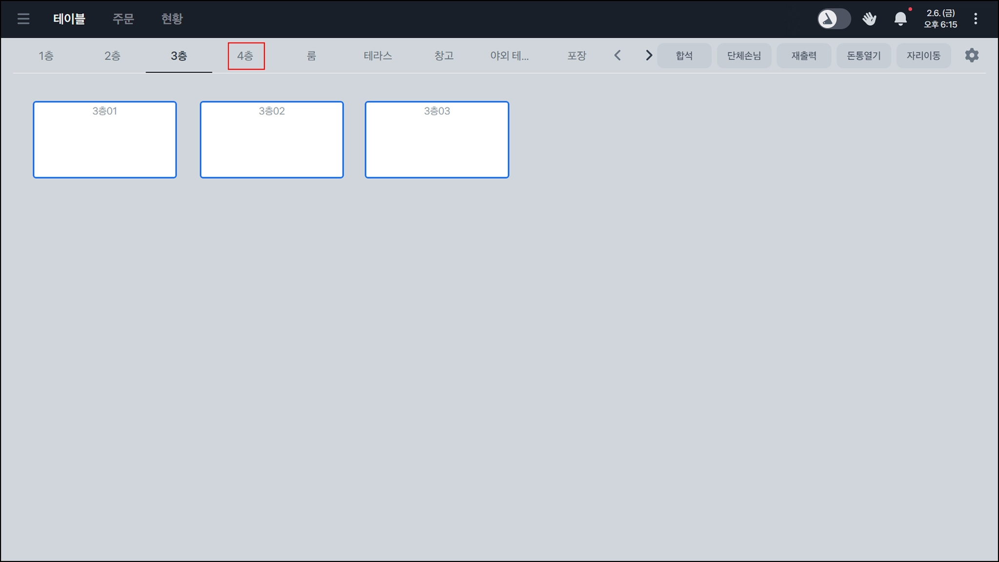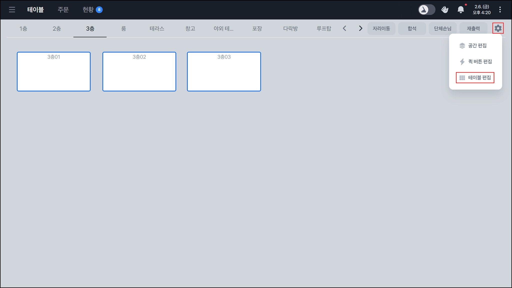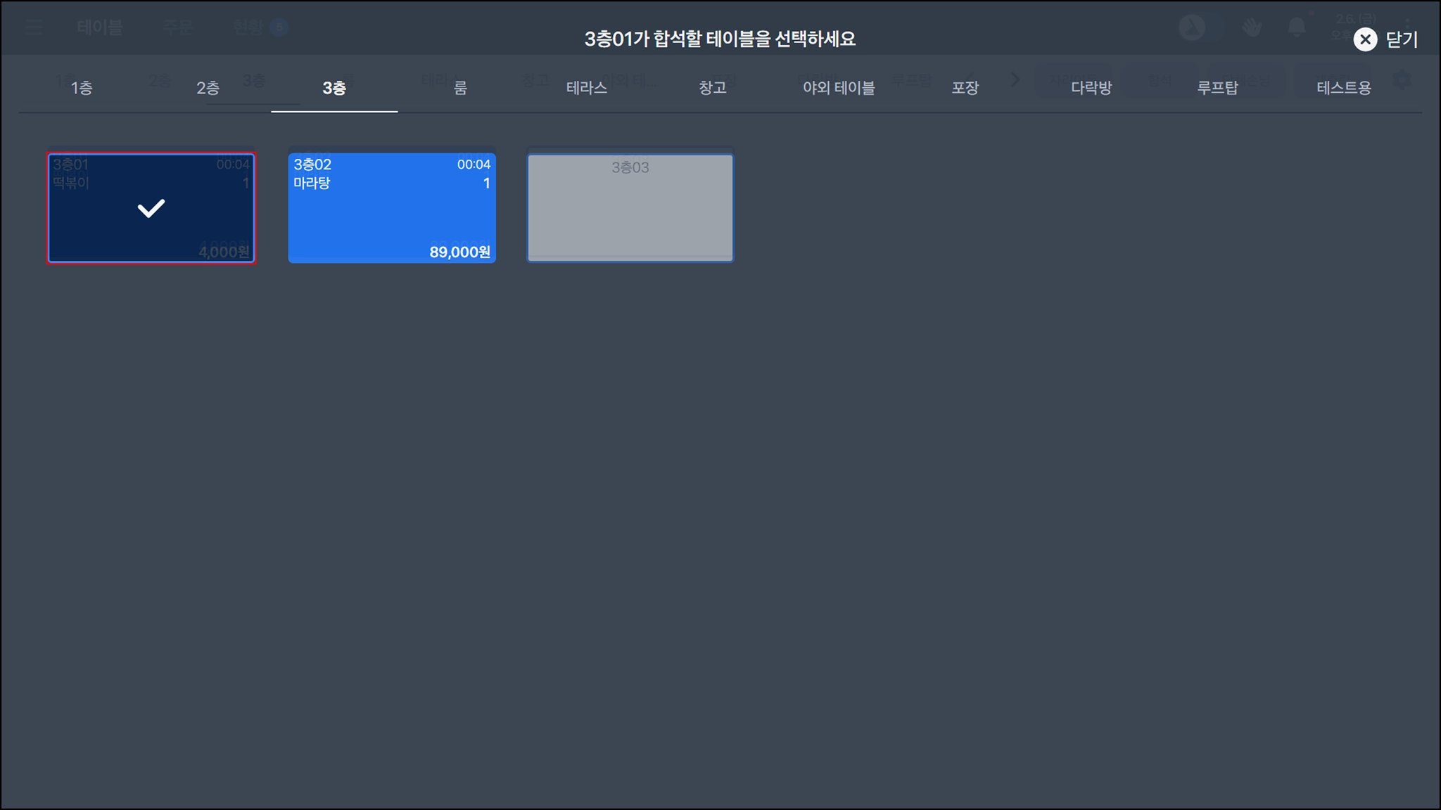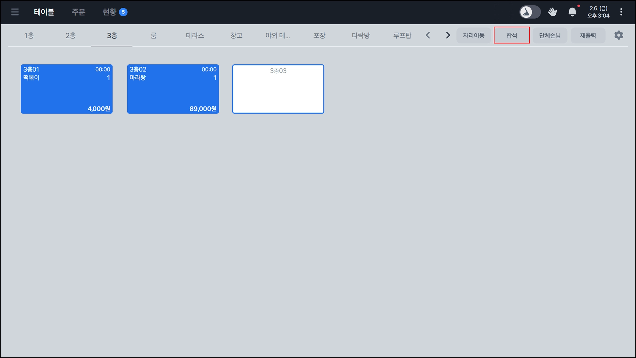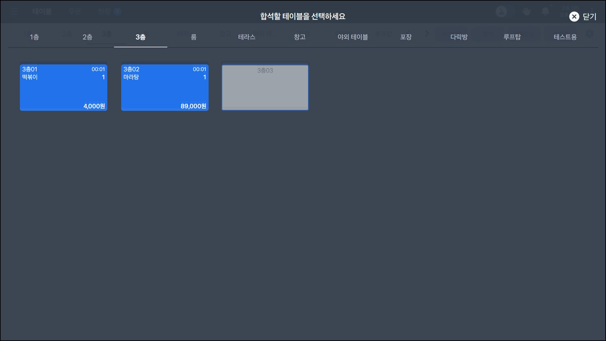 우측 상단의 합석을 누르면 두 테이블을 합석할 수 있어요