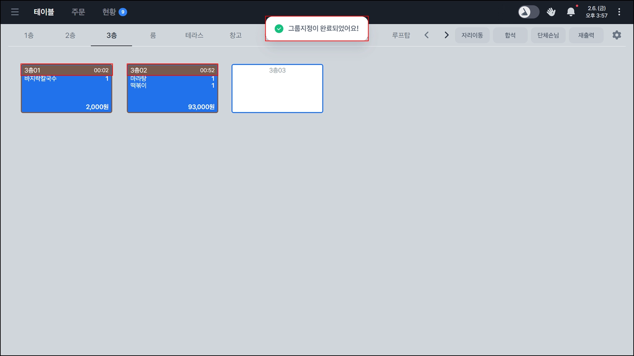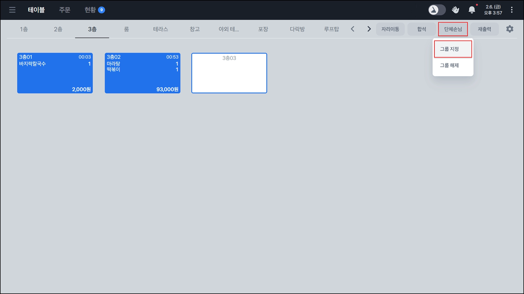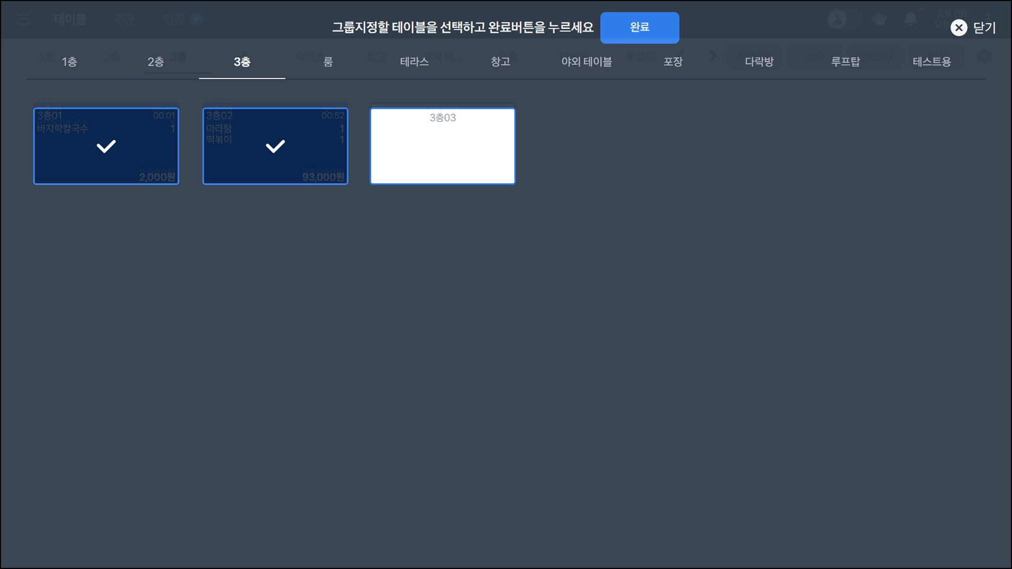 우측 상단의 단체 손님 → 그룹 지정 을 선택하면 여러 테이블을 같은 그룹으로 묶을 수 있어요.