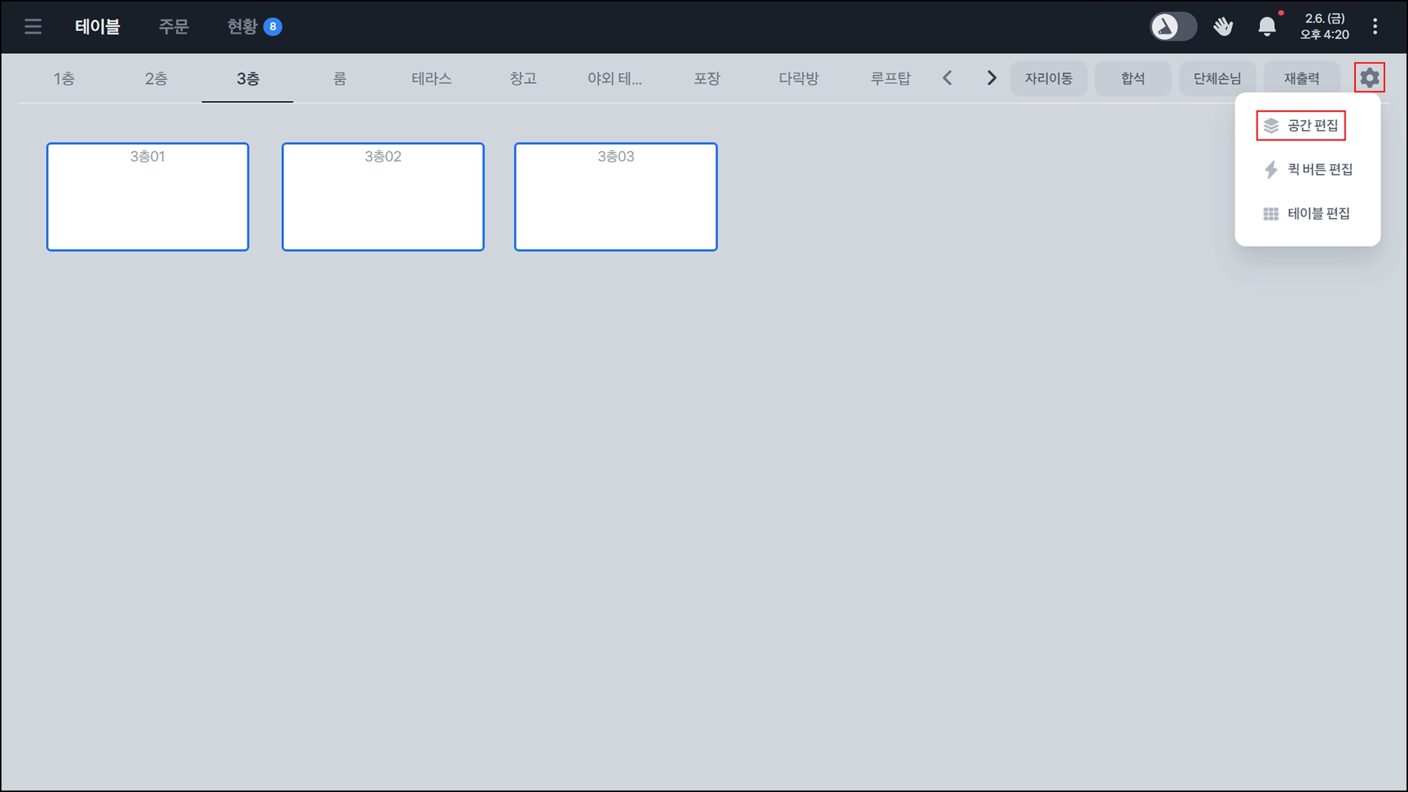 처음 토스포스 설치 후, 테이블 화면은 등록된 테이블과 공간이 없어요.