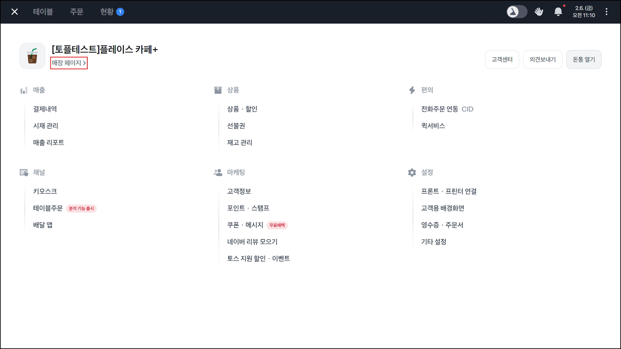 토스포스 좌측 상단 ≡ → 매장페이지를 클릭해 주세요.