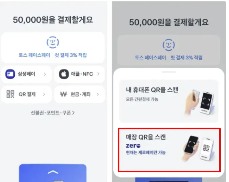 프론트 경로: QR 간편결제 선택 > 매장 QR을 스캔 선택 시 프론트에 제로페이 QR 화면이 노출돼요.