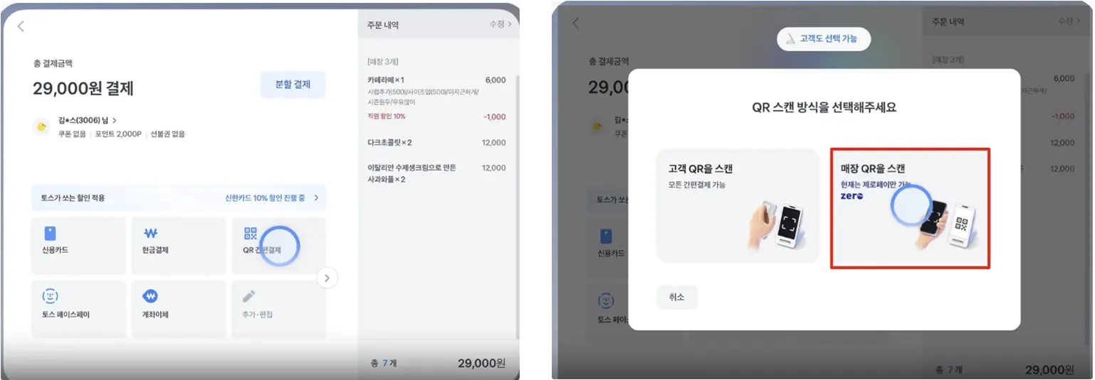 토스포스와 프론트를 같이 사용하는 매장이라면 프론트 결제창에도 제로페이 QR 결제수단이 화면이 노출돼요.