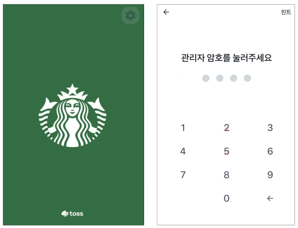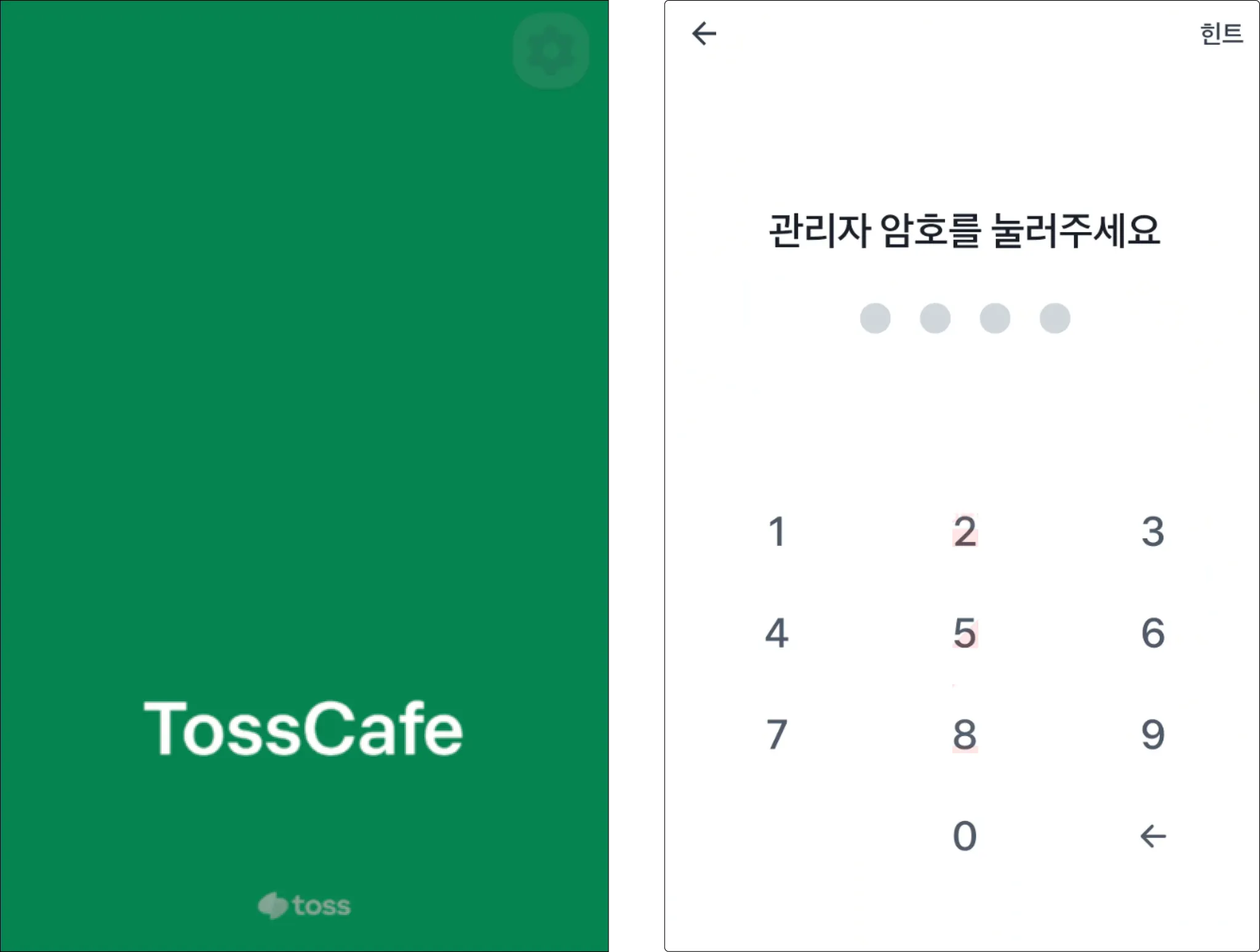 아이콘을 누르면, 관리자 암호 입력 화면이 보여요. (설정 아이콘은 5초가 지나면 다시 사라져요.)