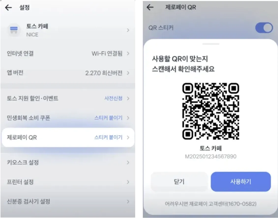 (중요) 제로페이 가맹점 앱 > 내 매장 QR 코드 > QR 검증을 통해 프론트에 보이는 QR정보와 제로페이 QR정보가 일치하는지 확인 후 사용하기를 선택해 주세요.