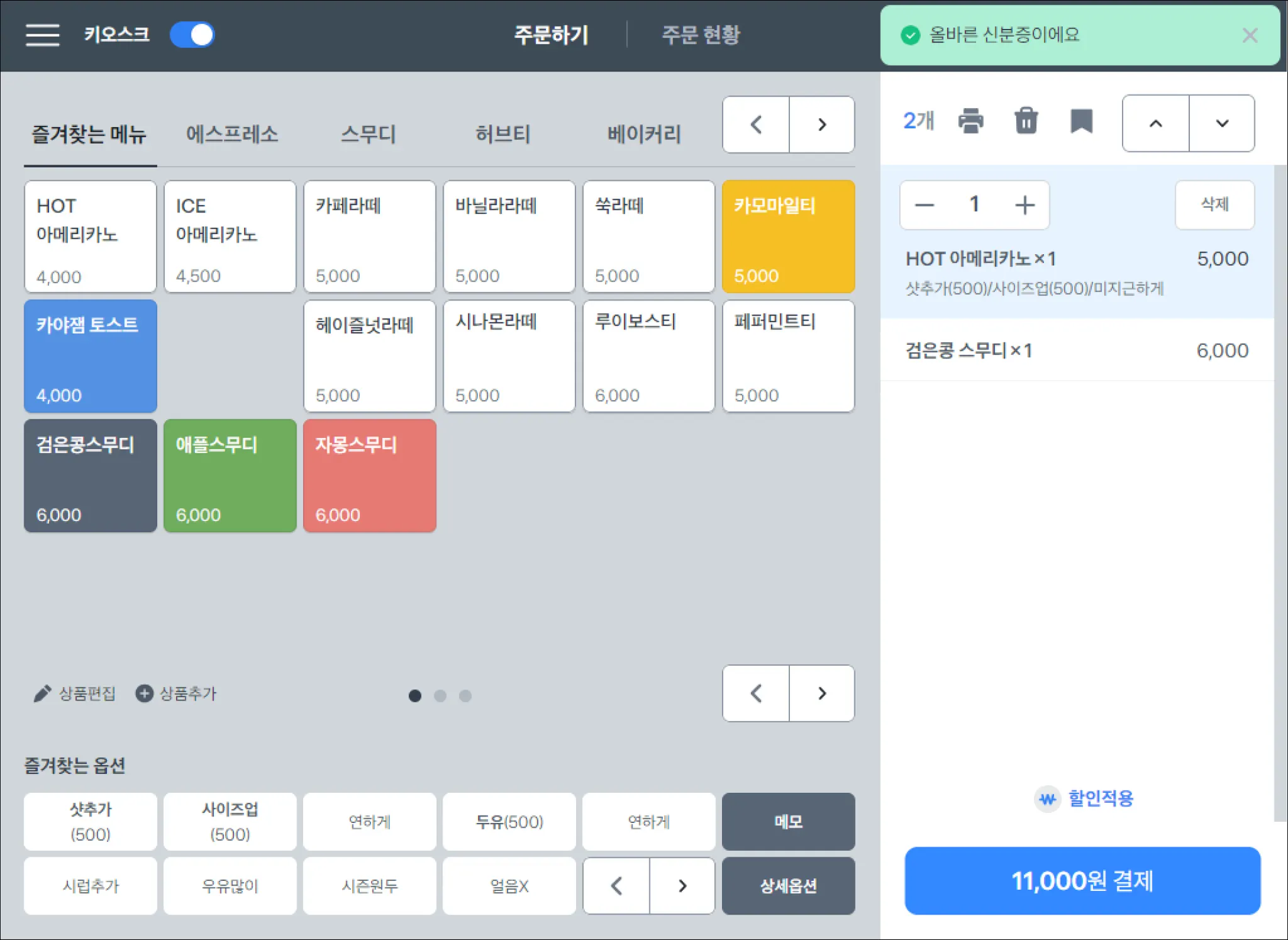 프론트에서 직접 결제 금액을 입력한 뒤, 카드나 현금 등 다양한 방식으로 결제하실 수 있어요.